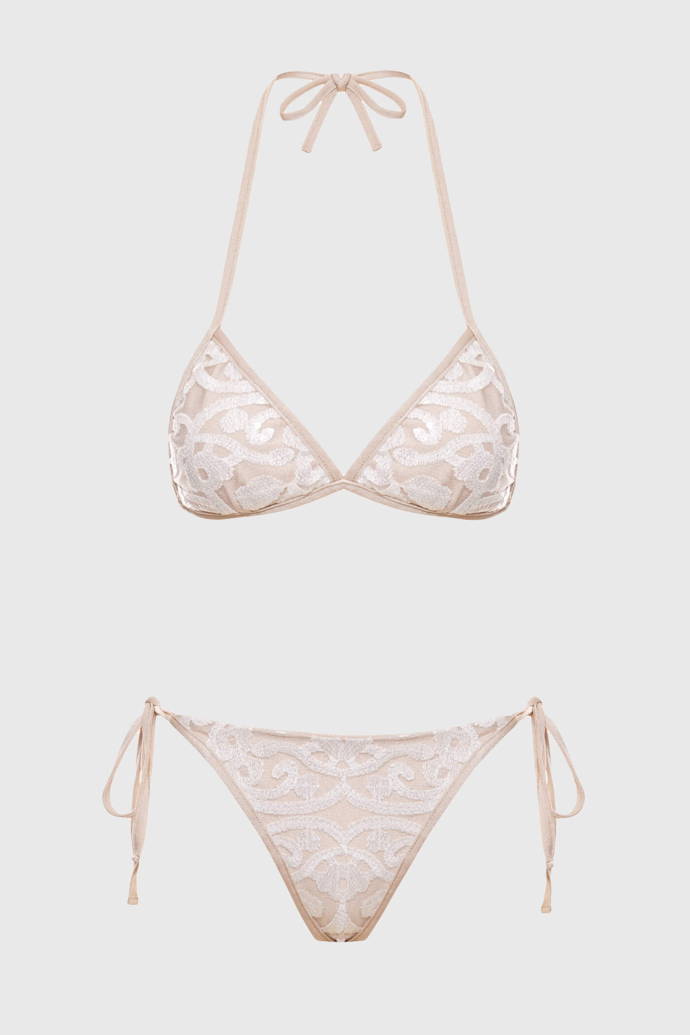 Połącz beżowy dół Loreen z górą bikini triangle z tej samej serii oraz narzutką z muślinu lub koronkową tuniką. Dobierz do tego plecioną torbę z frędzlami, sandałki z rzemykami i złotą biżuterię, aby stworzyć stylowy look inspirowany wakacjami w stylu Saint-Tropez lub Capri.