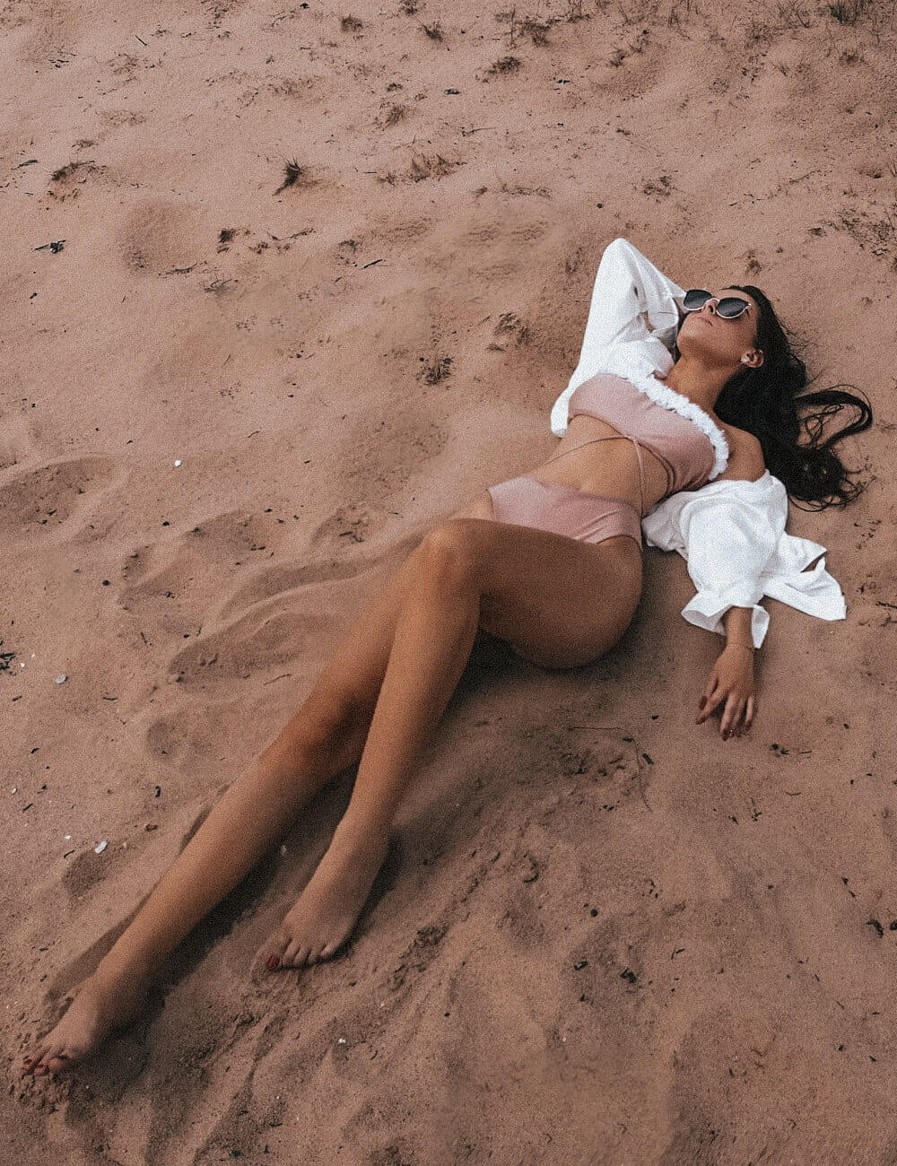- Desert Chic: Bikini + narzutka z koronki w kolorze écru + minimalistyczna biżuteria z muszli + skórzane klapki.