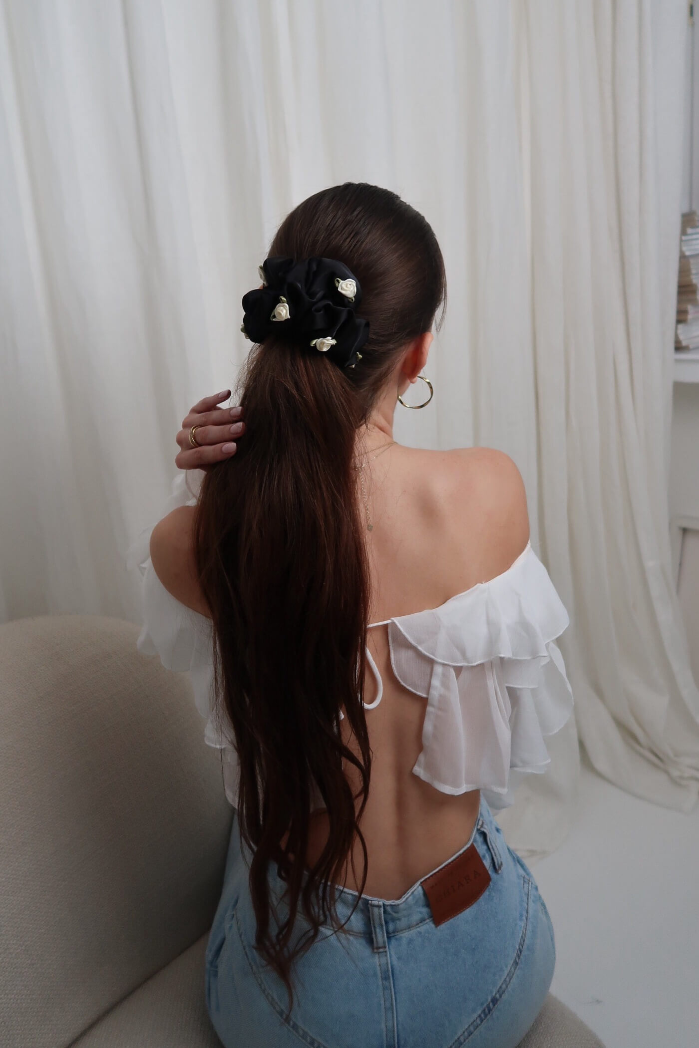 Scrunchie Medium Dark Liqueur to propozycja dla kobiet, które cenią wyrafinowane detale i subtelny kontrast. Czarny odcień połączony z różyczkami 3D w kolorze ecru tworzy efekt eleganckiej głębi, dodając fryzurze charakteru i szyku.