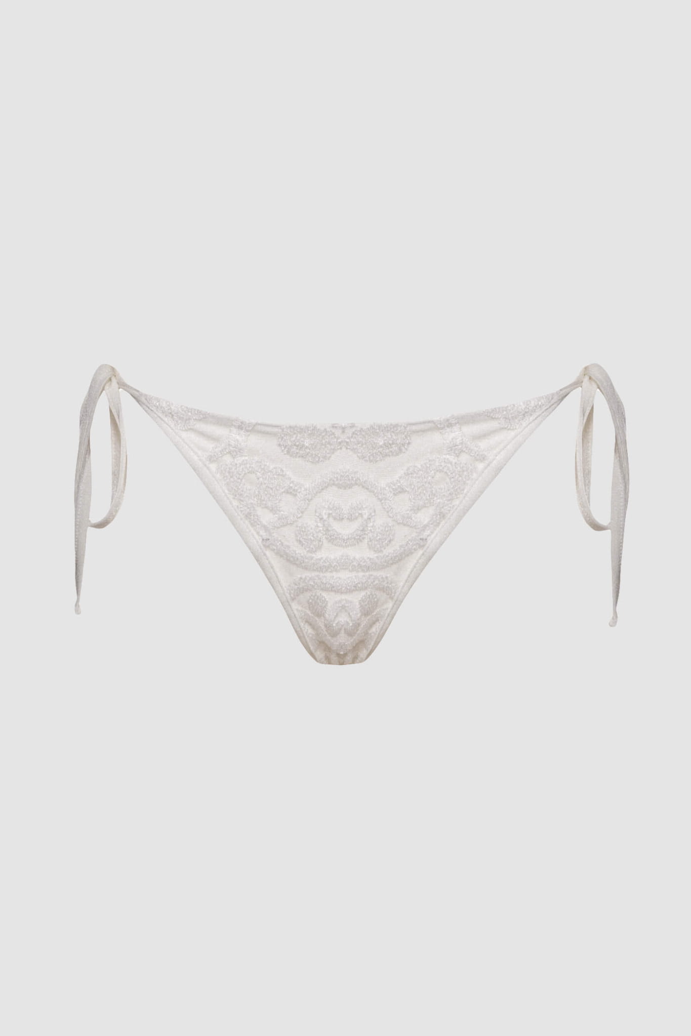 Dół bikini z ozdobną koronką z przodu i klasycznym tyłem ecru dopasowuje się do sylwetki dzięki bocznym wiązaniom. Miękka i sprężysta lycra najwyższej jakości gwarantuje wygodę, elastyczność i trwałość – nawet po wielu kontaktach z wodą.