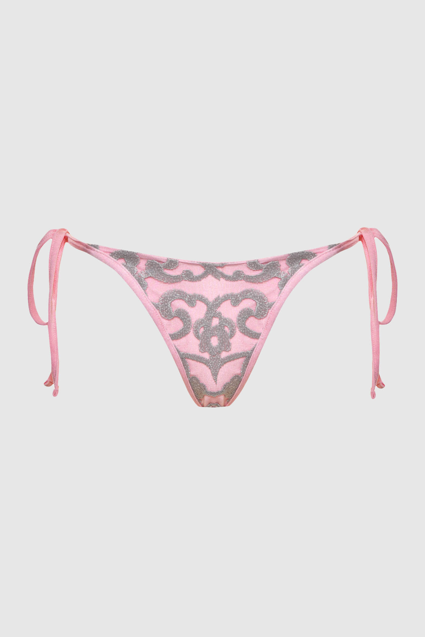Dół bikini z ozdobną koronką z przodu i gładkim, różowym tyłem dopełnia całości. Regulowane wiązania po bokach umożliwiają perfekcyjne dopasowanie do sylwetki, niezależnie od typu figury.